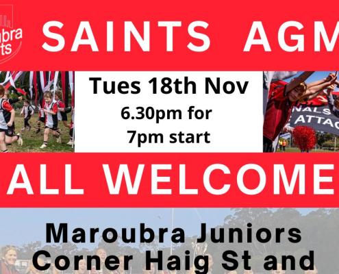 Renee Beck2025-10-24 08:50:362025-10-24 08:59:39Saints AGM 2025 – All Welcome!Celebrating 25 years in 2025, Maroubra Saints is Sydney’s largest junior AFL club — proudly inclusive, family-run, and focused on fun, fairness, and footy for all.